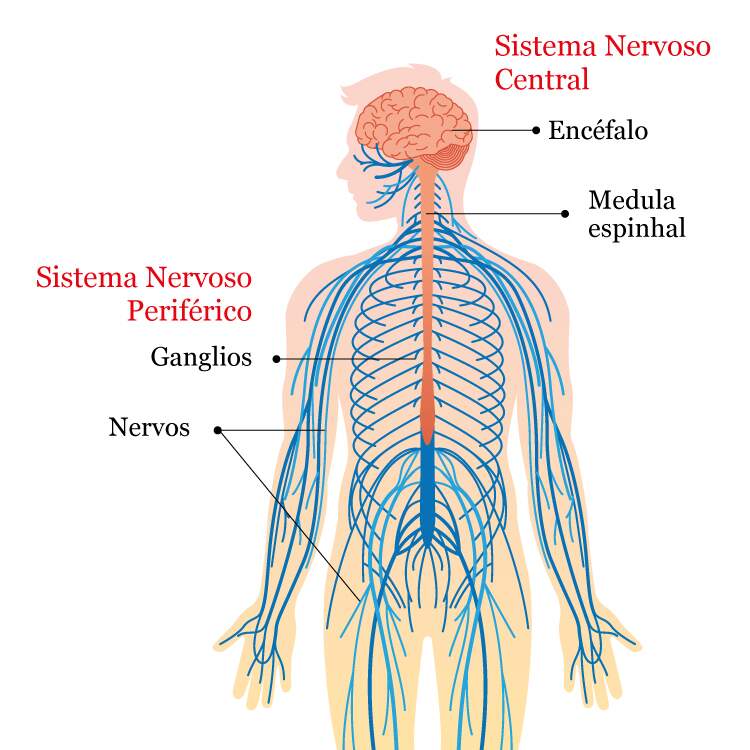 O sistema nervoso é dividido em duas componentes anatômicas: periférico, composto por nervos e gânglios; e central, composto pela medula espinhal e pelo encéfalo, que contém o cérebro.